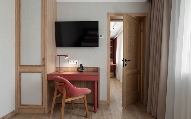 Номер разделён на спальню и гостиную. В вашем распоряжении будет телевизор, диван, шкаф, рабочий стол со стулом. Также в номере есть сплит-система, встраиваемый мини-холодильник, чайная и кофейная станции, сейф и гладильные принадлежности.